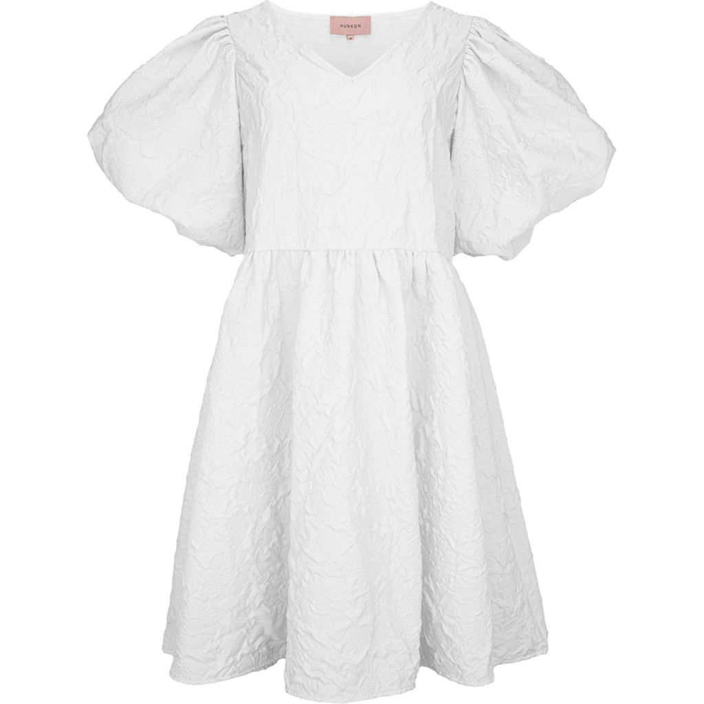Super flot kjole fra Hunkøn med fede detaljer i materialet. Kjolen har store pufærmer, V-udskæring og en løs pasform.