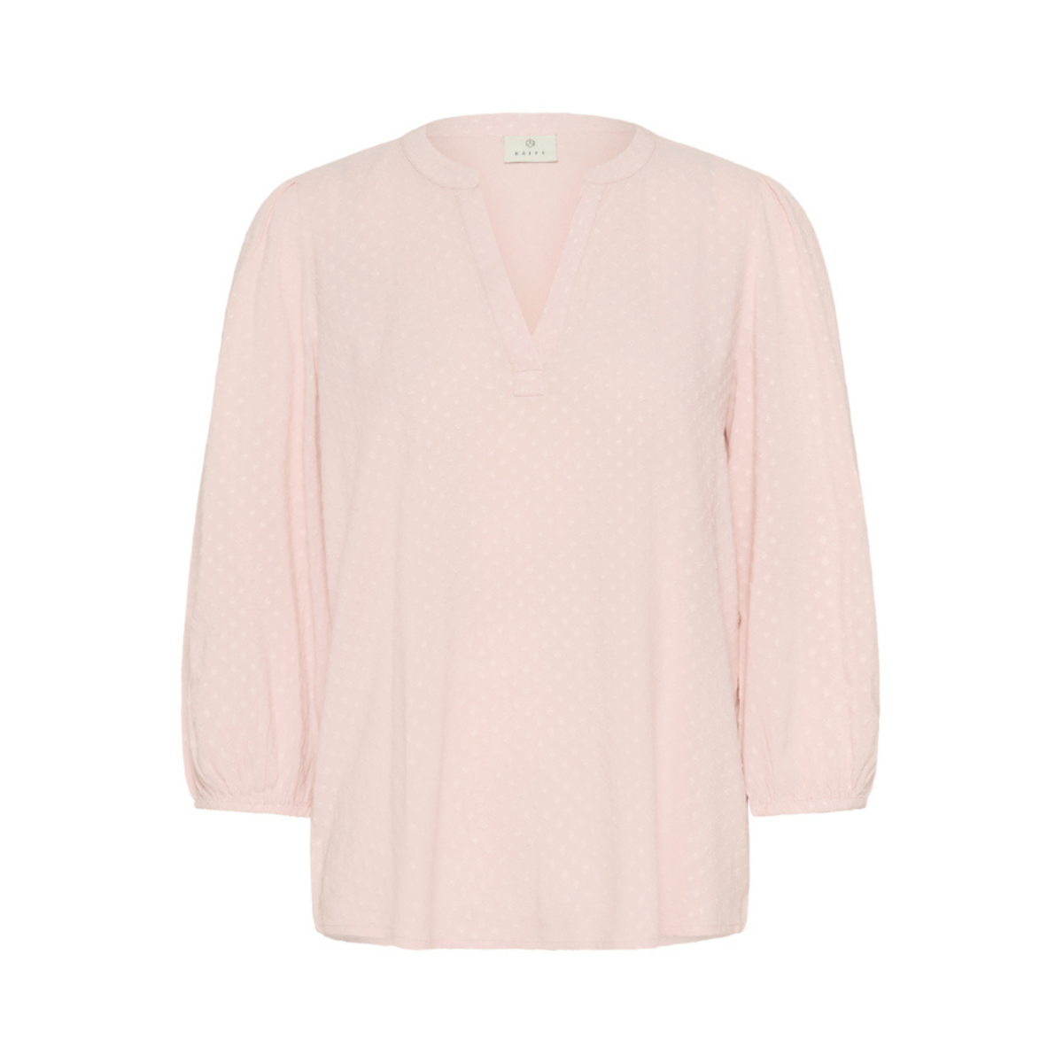Smuk bluse fra Kaffe. Blusen har V-udskæring, lange ballonærmer med elastik forenden samt en løs og luftig pasform i et fint prikket mønster.