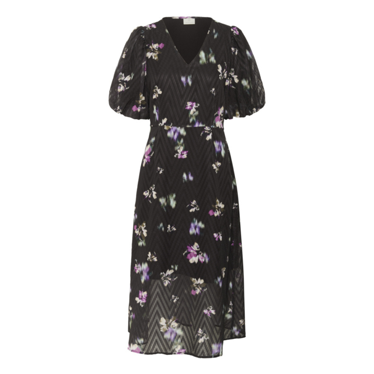 Skøn lang kjole fra Kaffe. Kjolen har V-udskæring, korte pufærmer samt et fint mønster.