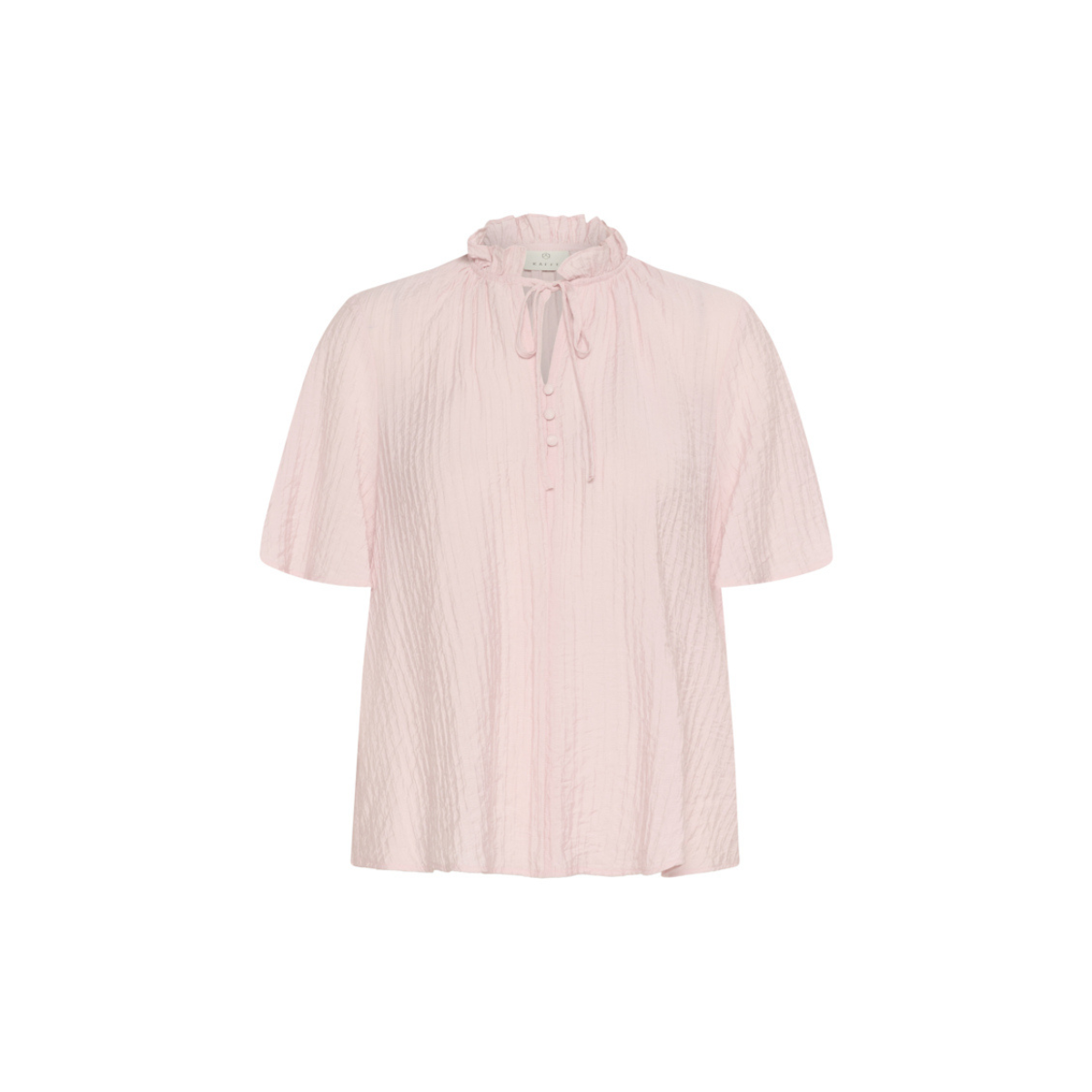 Sød bluse fra Kaffe. Blusen har V-udskæring, knaplukning og bindebånd samt korte ærmer. Materiale: 80% Viskose. 20% Nylon. Vaskeanvisning: Vaskes ved 30 grader.