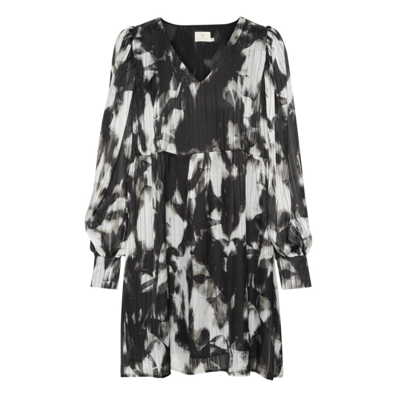 Skøn kjole fra Kaffe. Kjolen har V-udskæring, lange brede ærmer og går til lidt over knæene. Derudover er den flagrende og har et fint mønster.