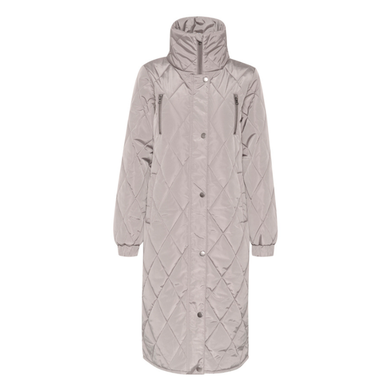 Lækker lang jakke med både bryst- og sidelommer og halsen er høj. Jakken har slids der kan lukkes efter eget ønske.
