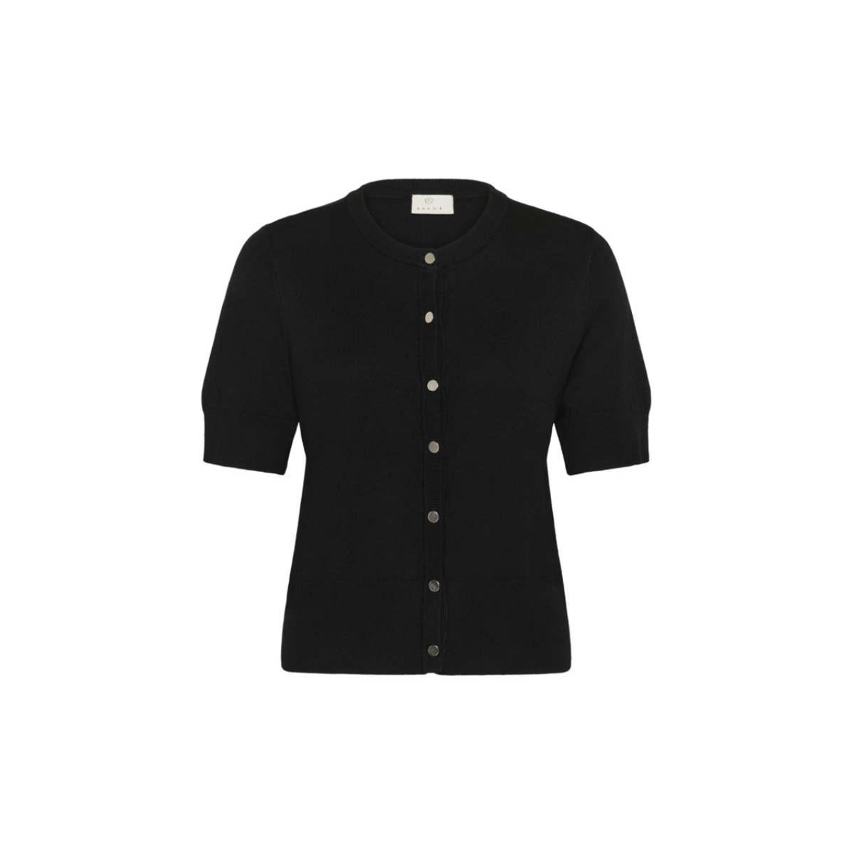 Sød cardigan fra Kaffe. Cardiganen er gennemknappet, har en rund halsudskæring samt korte ærmer.