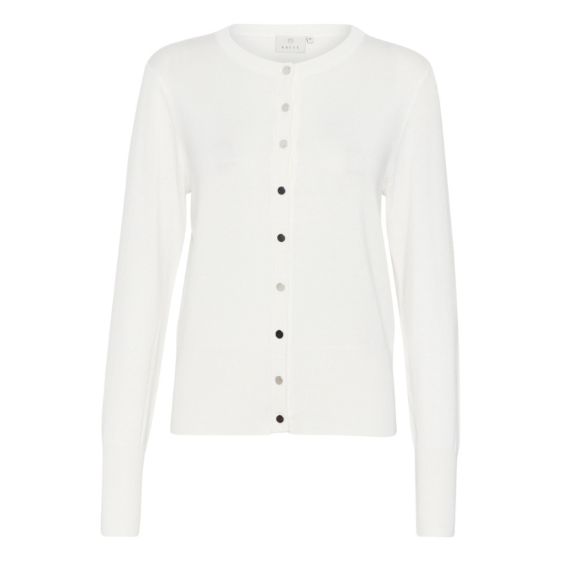 Fin og blød cardigan fra Kaffe. Cardiganen har rund halsudskæring, ribkant detaljer ved alle afslutninger og er gennemknappet med sølvknapper. Materiale: 80% Viskose. 20% Nylon. Vaskeanvisning: Vaskes ved 30 grader.