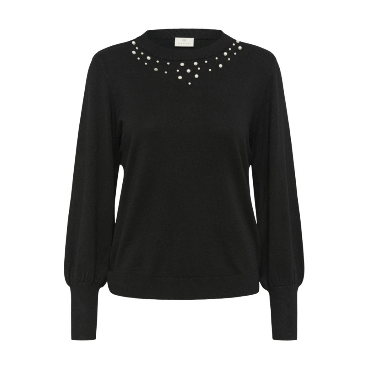 Enkel og fin strik fra Kaffe. Strikken har en rund hals samt lange ballonærmer med en bred ribkant detalje ved håndledet. Deruover har den fine perler i forskellige størrelser ved halsen.