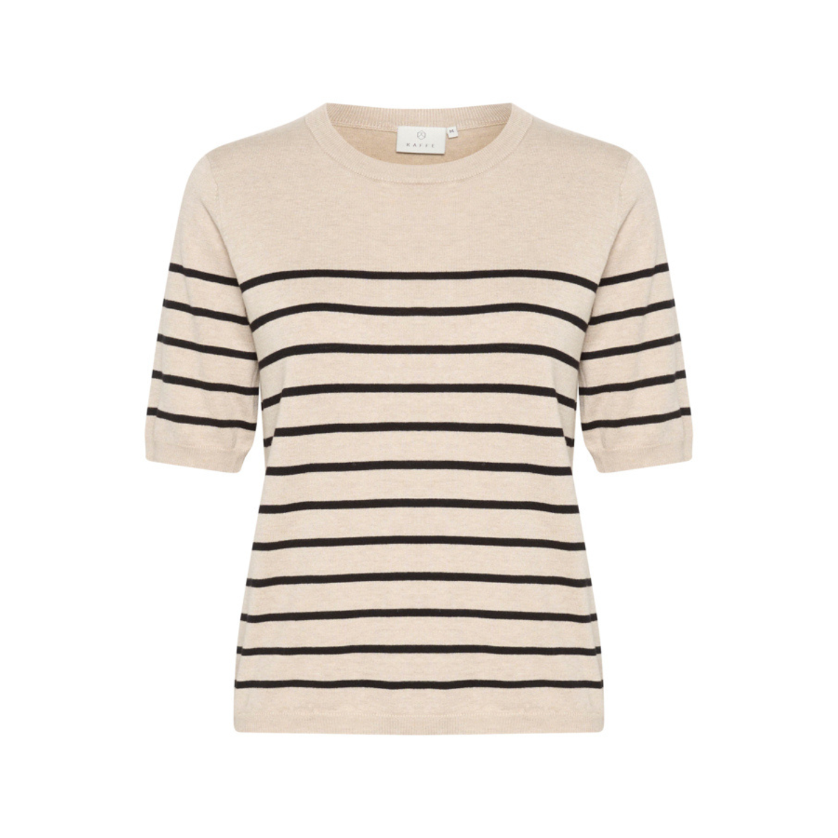 Lækker tynd strik fra Kaffe. Strikken har ribdetaljer i alle udskæringer, rund hals og korte ærmer.