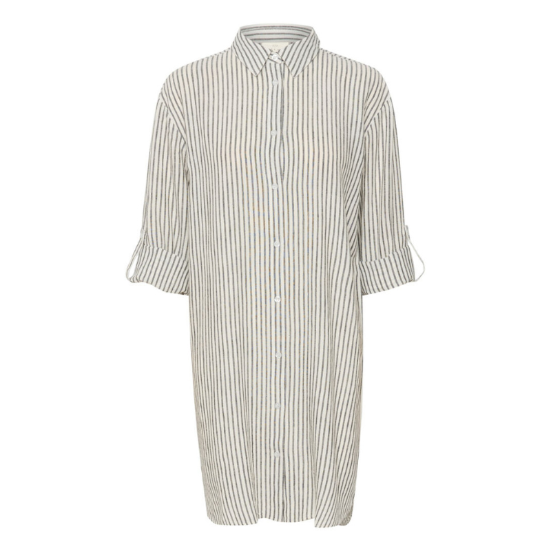 Skøn skjortekjole i hørblanding fra Kaffe. Kjolen er gennemknappet, har striber og lange ærmer der kan foldes op og sættes i en knap.