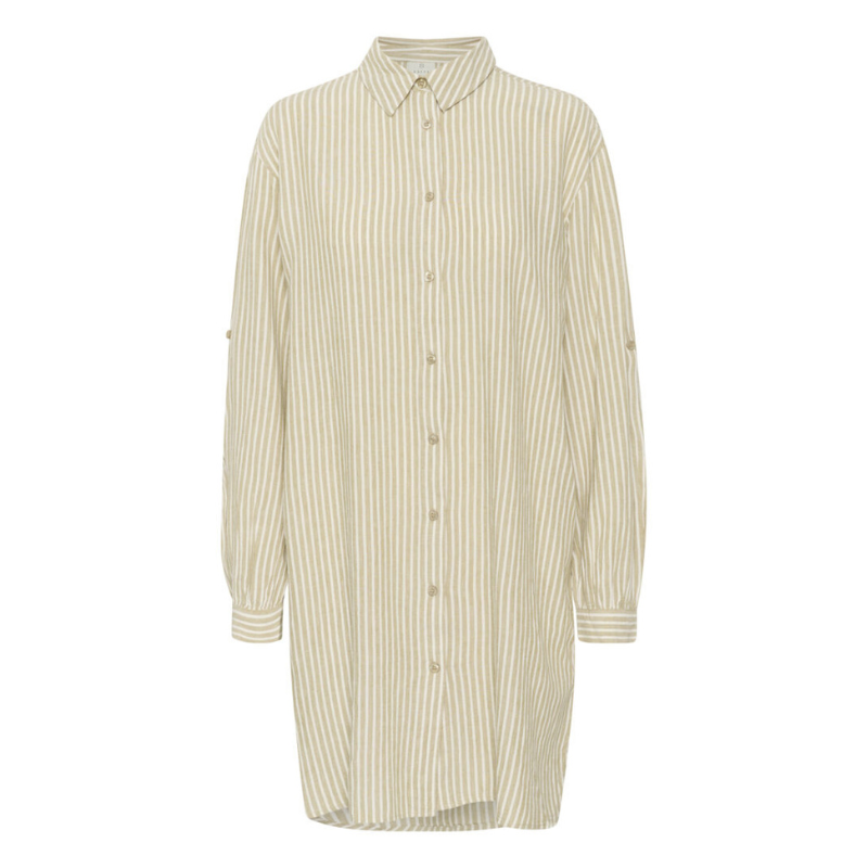 Skøn skjortekjole i hørblanding fra Kaffe. Kjolen er gennemknappet, har striber og lange ærmer der kan foldes op og sættes i en knap.