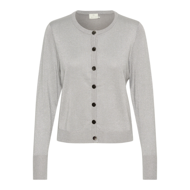 Fin cardigan fra Kaffe. Cardiganen er gennemknappet, har ribkant detalje ved alle afslutninger samt lurex tråde i sig. Materiale: 80% Viskose. 20% Metallisk garn. Vaskeanvisning Vaskes ved 30 grader.