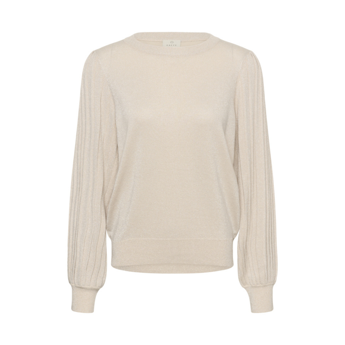 Flot strik fra Kaffe. Strikken har rund hals, ribkant i alle afslutninger samt lurex tråde i sig. Materiale: 70% Viskose. 20% Nylon. 10% Polyester. Vaskeanvisning: Vaskes ved 30 grader.