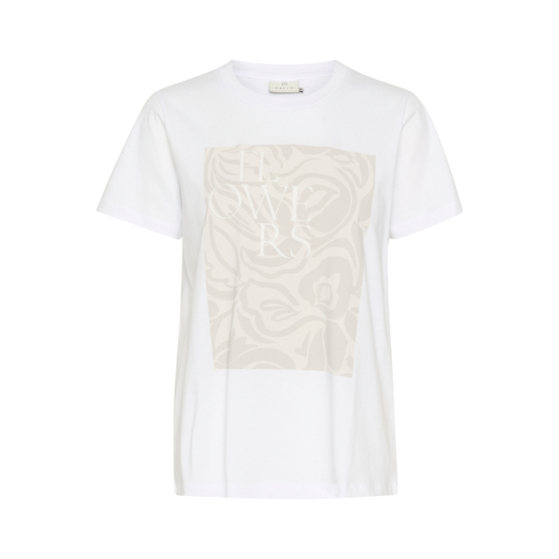 Flot t-shirt fra Kaffe. T-shirten har rund hals, en normal pasform samt et fint print fortil. Materiale: 100% Bomuld. Vaskeanvisning: Vaskes ved 30 grader.