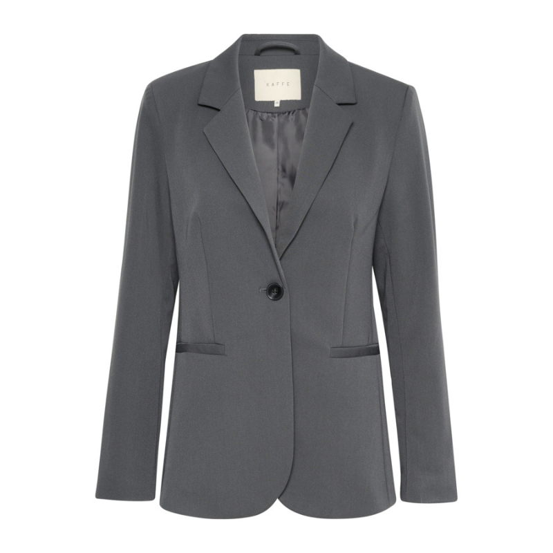 Super cool blazer fra Kaffe. Denne blazer har skulderpuder, to pyntelommer og en knap frotil.