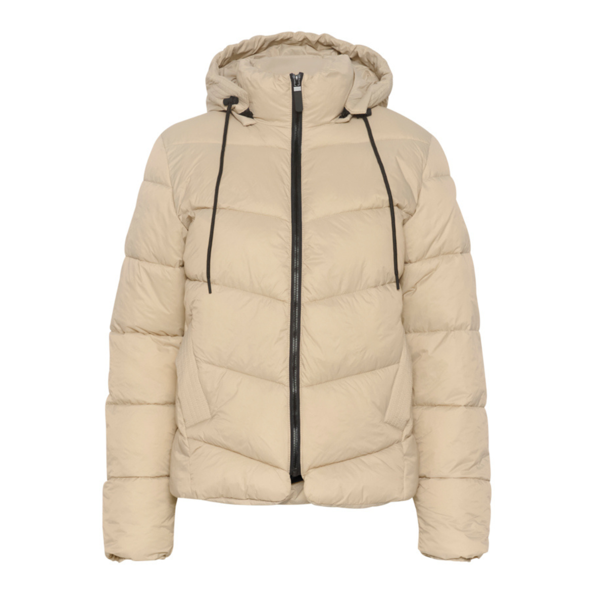 Fed jakke fra Kaffe. Jakken har lynlåslukning, hætte samt to lommer fortil.