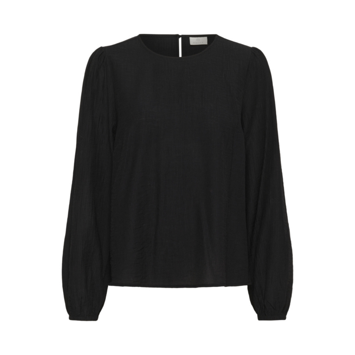 Fin bluse fra Kaffe. Blusen er meget let og luftig med en struktur i materialet. Derudover har den lange pufærmer med elastik forenden og en rund halsudskæring der lukkes med knap i nakken.