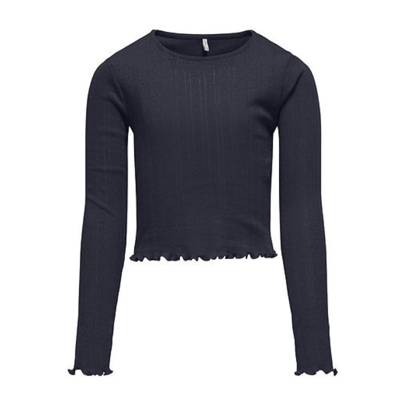 Mega fin basic langærmet bluse fra Kids Only. Blusen har en rund hals, et fint hulmønster samt flæsedetalje ved håndledet og taljen.