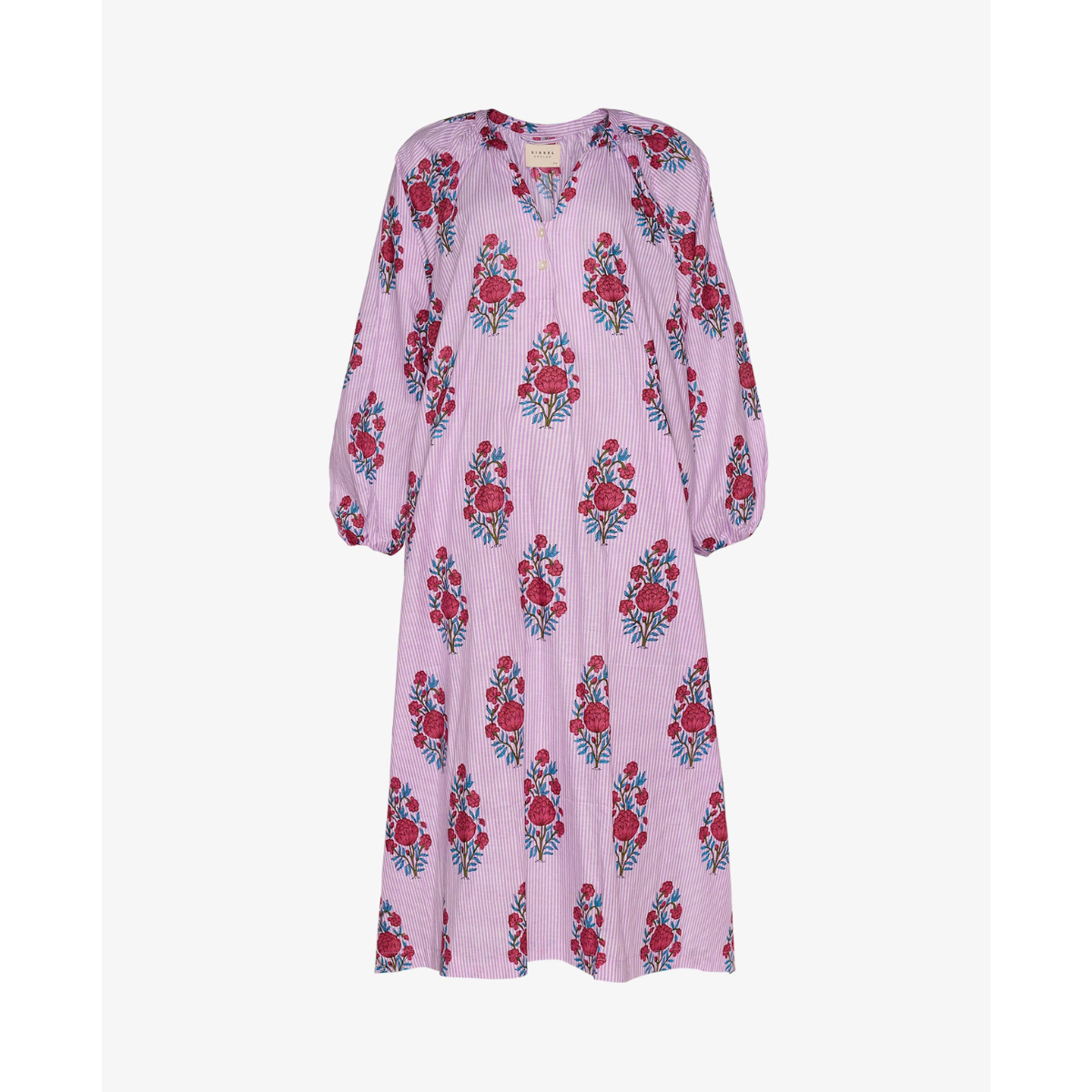 Smukkeste kjole fra Sissel Edelbo. Kjolen har V-hals med to knapper forenden, lange ærmer med elastik ved håndledet, sidelommer samt et slids i begge sider. Kjolen er i en løs pasform og har et smukt, ensartet print.