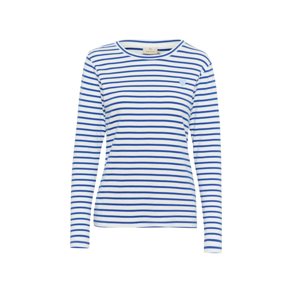 Super fin, stribet bluse, med lange ærmer, fra Kaffe. Denne søde bluse har vandrette striber, et lille hjerte ved venstre bryst og en rund hals-udskæring.