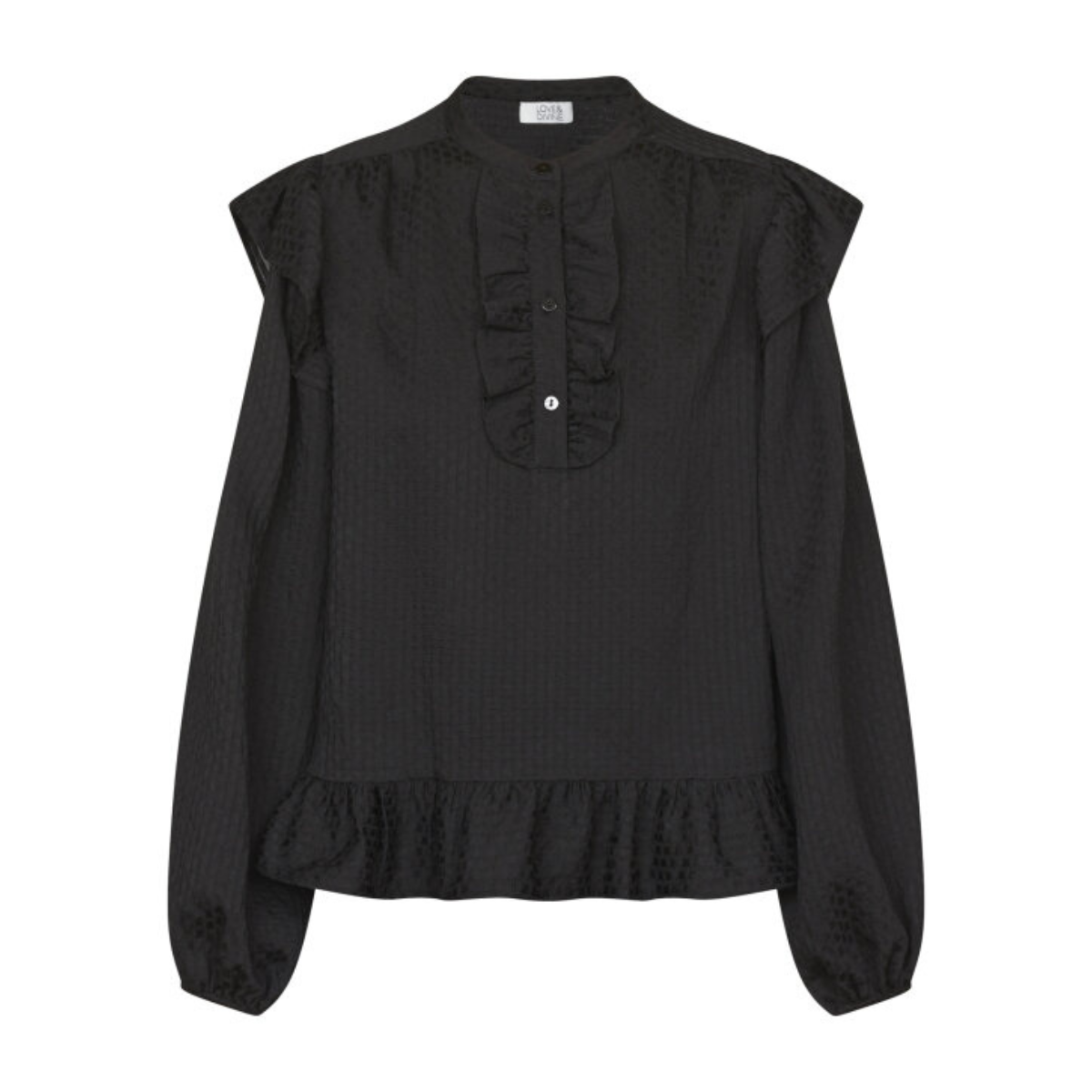 Smuk bluse fra Love & Divine. Blusen har en rund hals der forlænges med 4 knapper, lange ærmer med elastik forenden samt en masse fine flæsedetaljer.