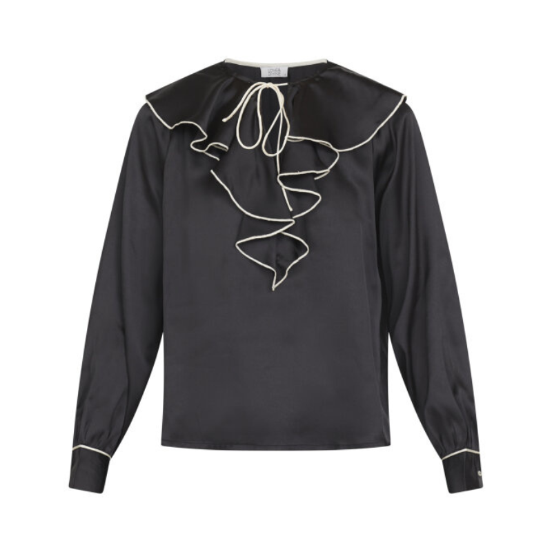 Mega fin bluse fra Love&Divine. Blusen har v-udskæring med bindebånd og flæsedetaljer med hvis afslutning. Derudover har den lange ærmer med knaplukning og en hvid detalje.