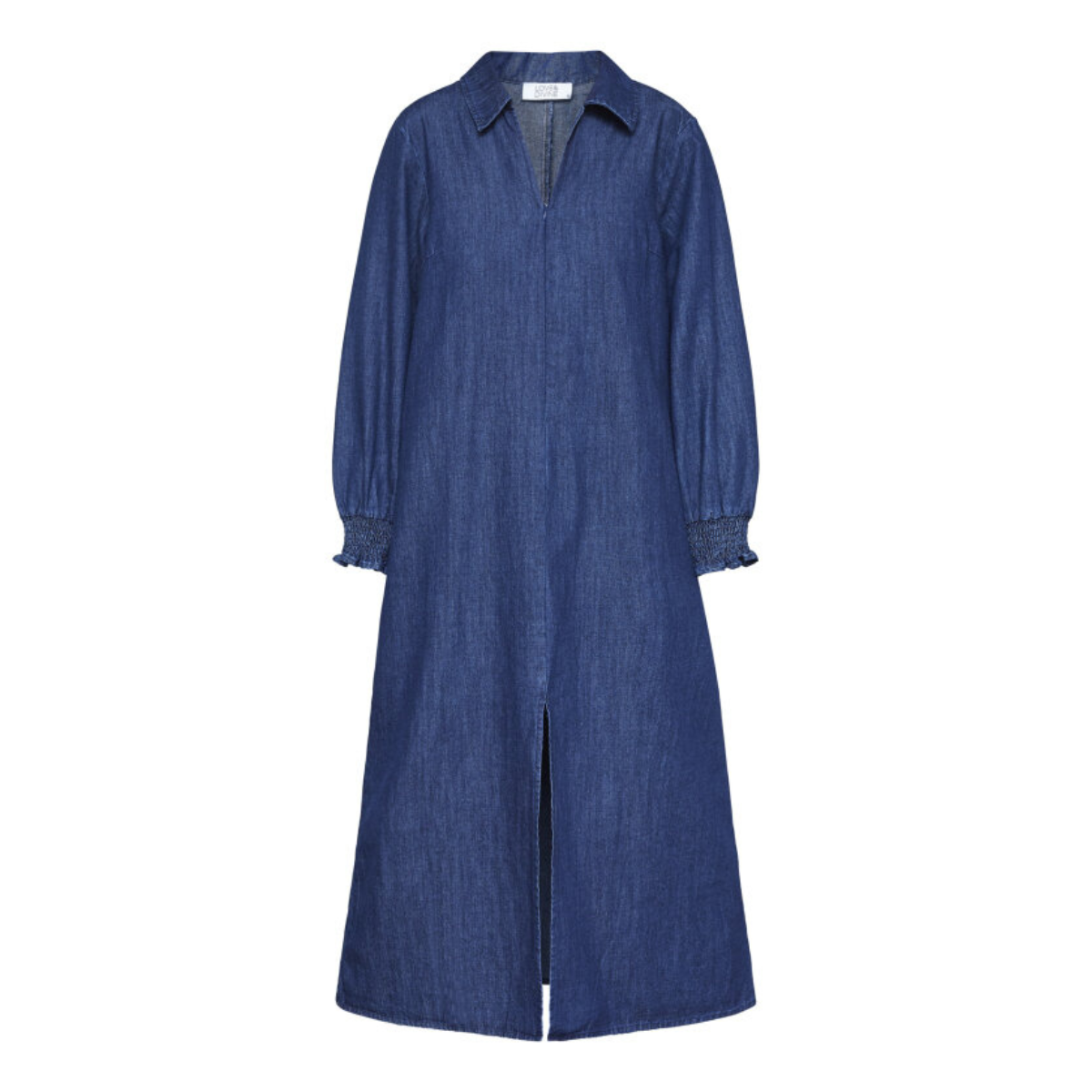 Fin kjole fra Love & Divine. Det er en lang denimkjole med klassisk krave, V-udskæring og lange ærmer med smockdetalje ved håndledet. Derudover er der et slids foran i midten.