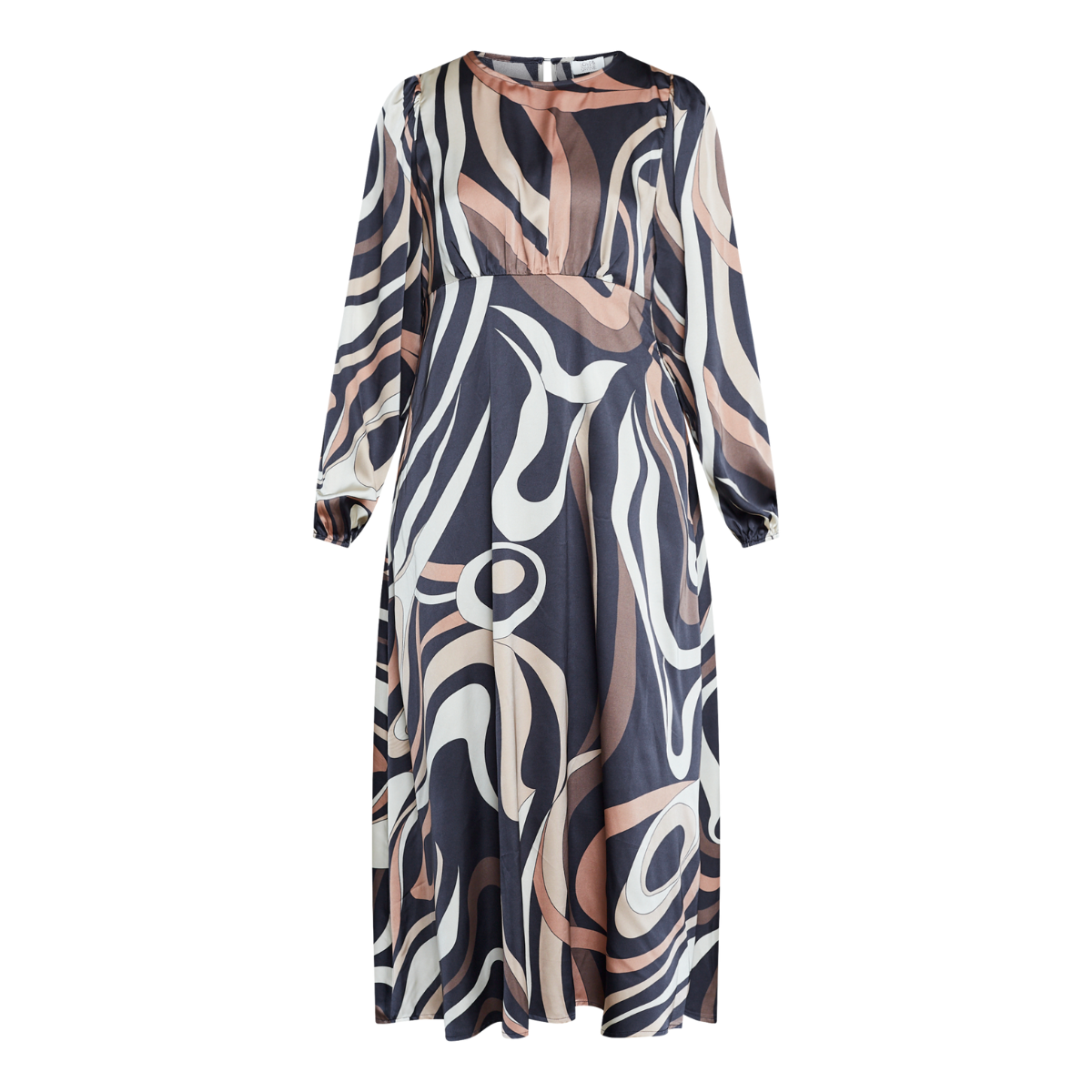 Smuk lang kjole fra Love & Divine. Kjolen har en rund hals med knaplukning i nakken, lange brede ærmer med elastik forenden og et smukt grafisk mønster.