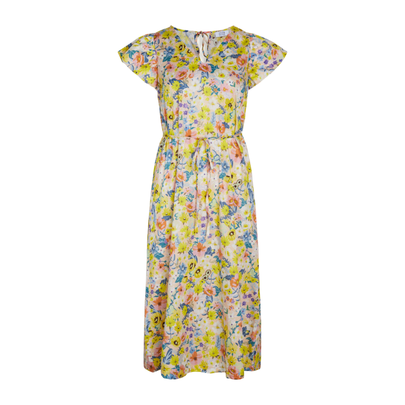 Knælang, blomstret kjole med v-udskæring og bindebånd.