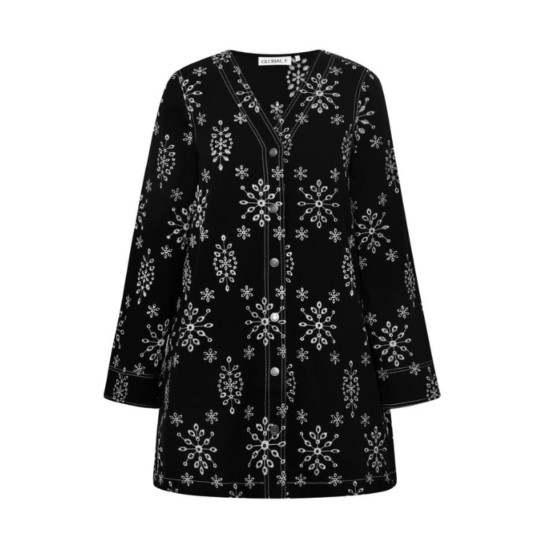 Skønneste kjole fra Global Funk. Kjolen har V-udskæring, brede ærmer og er gennemknappet. Den sidder løst og den findes også som jakke og jeans. Materiale: 100% Bomuld. Vaskeanvisning: Vaskes ved 30 grader.