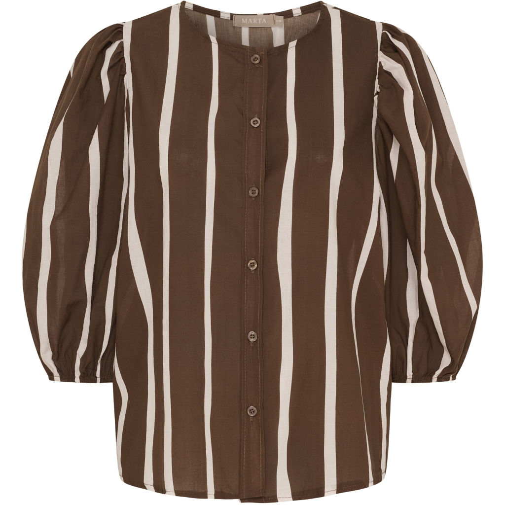 Flot bluse fra Marta. Blusen har en rund halsudskæring, bindebånd i venstre side samt ærmer de går til albuerne. Materiale: 100% Bomuld. Vaskeanvisning: Vaskes ved 30 grader.