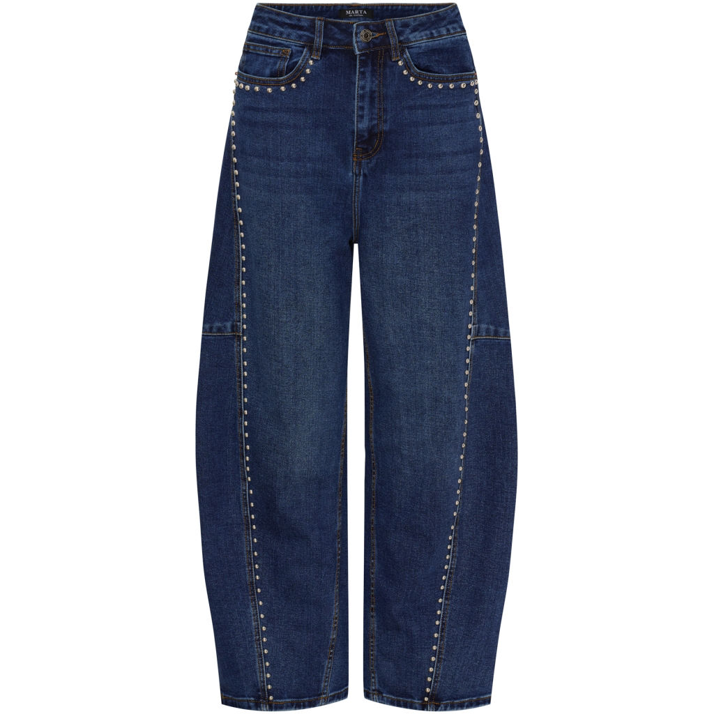 Mega fede jeans fra Marta. Jeansene har knap- lynlåslukning, de 5 klassiske lommer samt nitter ved lommerne og ned af benene. Materiale: 70% Bomuld. 29% Polyester. 1% Elastan. Vaskeanvisning: Vaskes ved 30 grader.