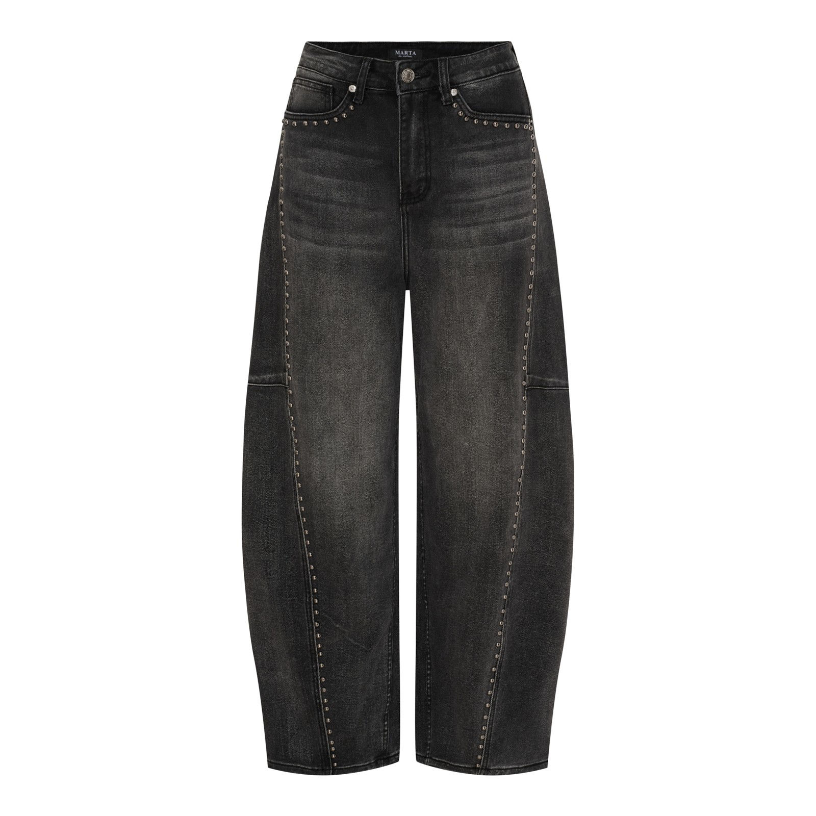 Mega fede jeans fra Marta. Jeansene har knap- lynlåslukning, de 5 klassiske lommer samt nitter ved lommerne og ned af benene. Materiale: 70% Bomuld. 29% Polyester. 1% Elastan. Vaskeanvisning: Vaskes ved 30 grader.