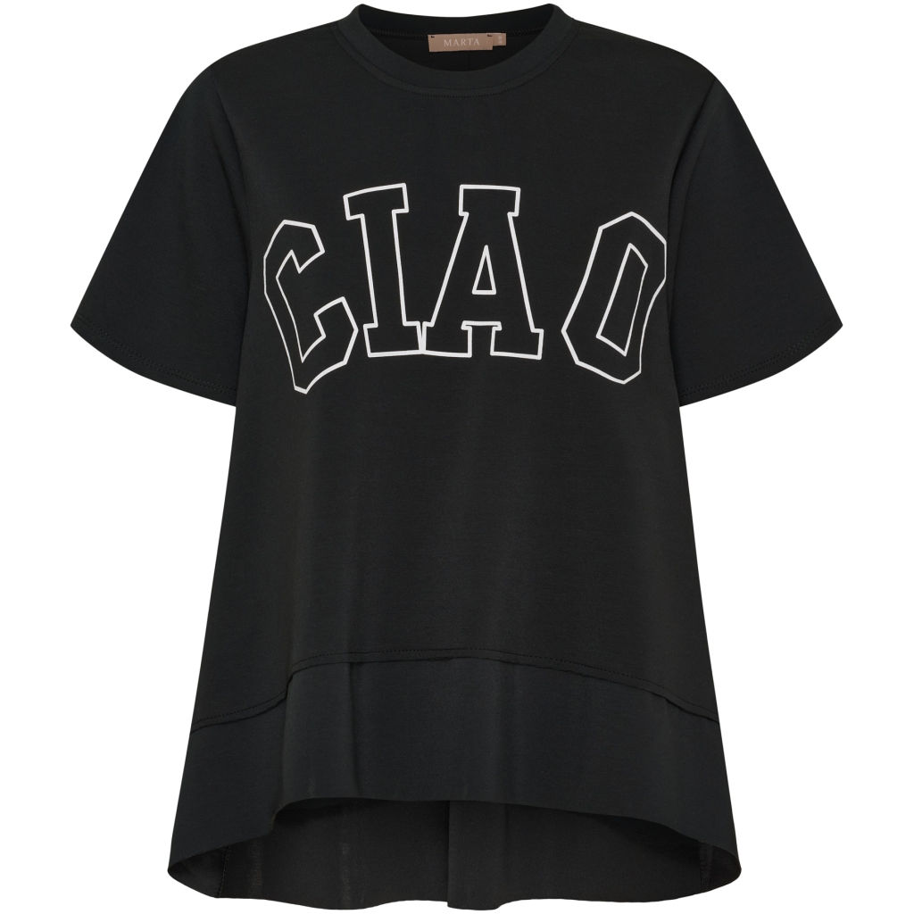 Lækker sweatbluse fra Marta. Den har en rund hals, korte ærmer, er længere bagtil samt har skrift over brystet.