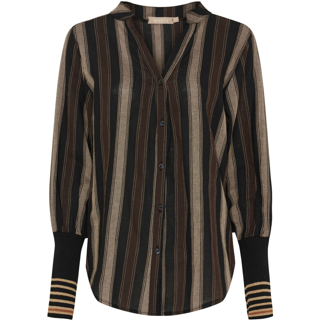 Flot stribet skjorte fra Marta. Skjorten har V-udskæring, lange ærmer med ribkantdetalje ved håndledet samt er gennemknappet.