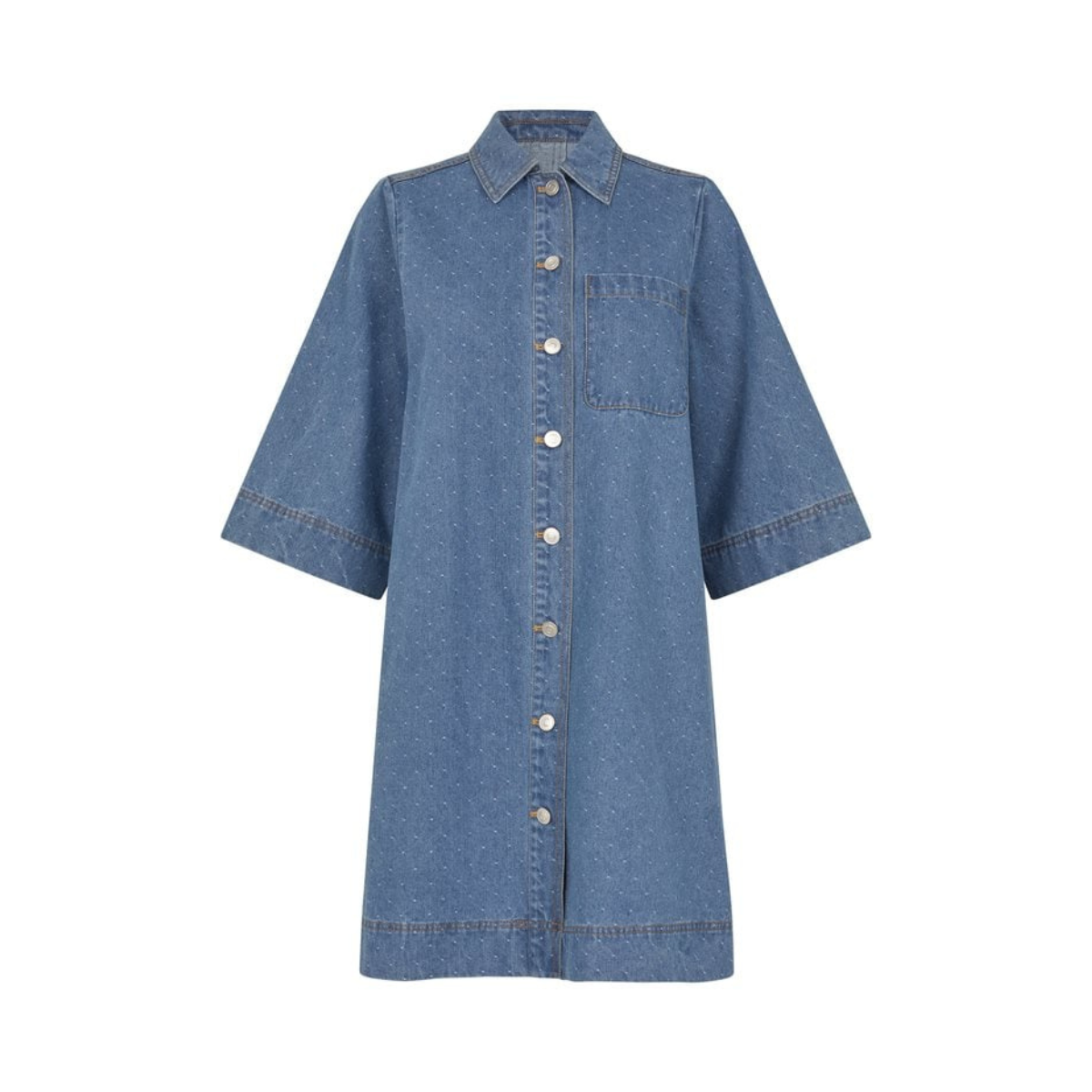 Mega cool kort denimkjole fra Global Funk. Kjolen er gennemknappet, har en bystlomme samt små lyseblå prikker.
