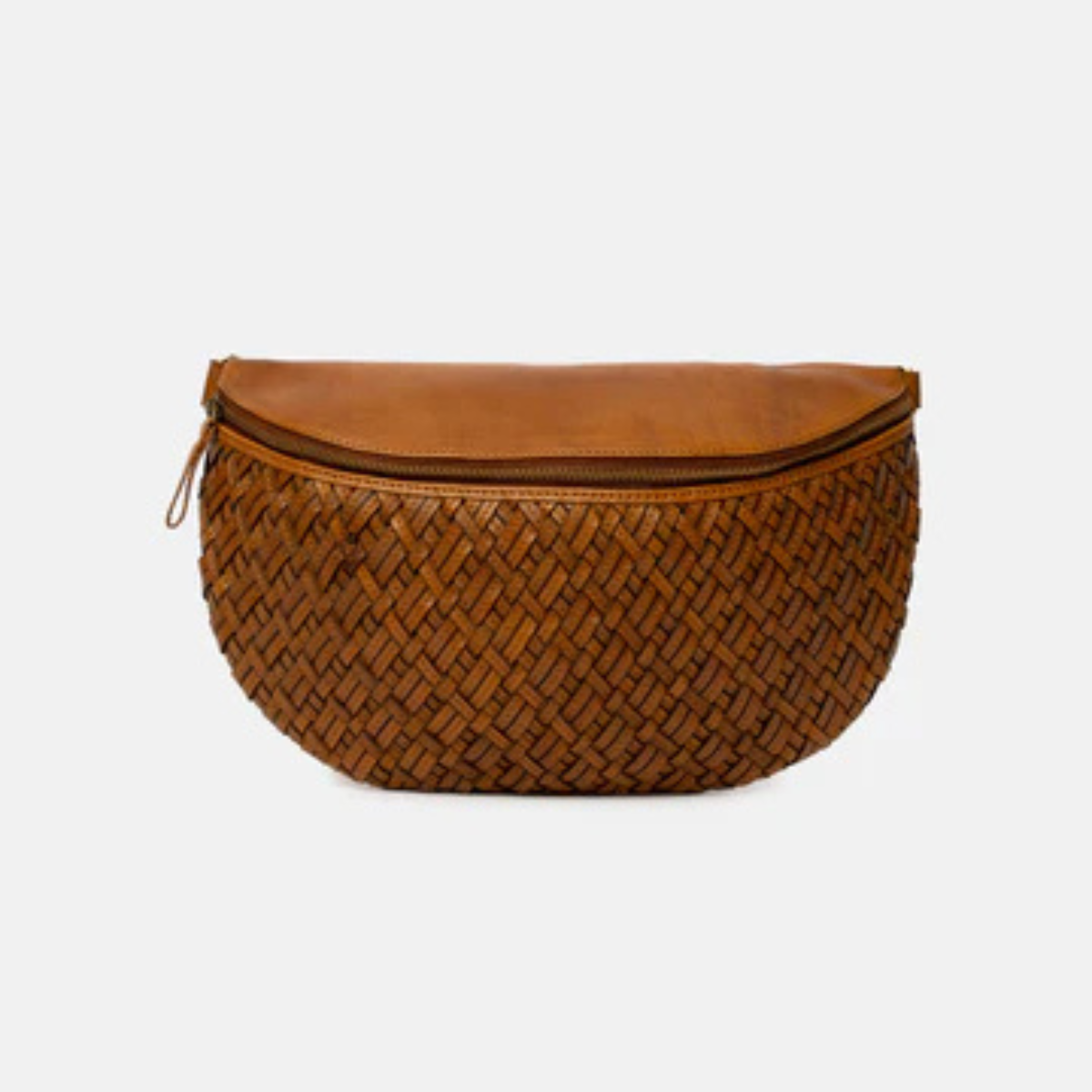 Stilfuld bumbag fra Re:Designed. Tasken har et smukt flettet mønster på forsiden og bagsiden er glat læder. Den har en justerbar og aftagelig rem samt indvendige rum med massere af plads, hvor alle rum lukkes med lynlåse.