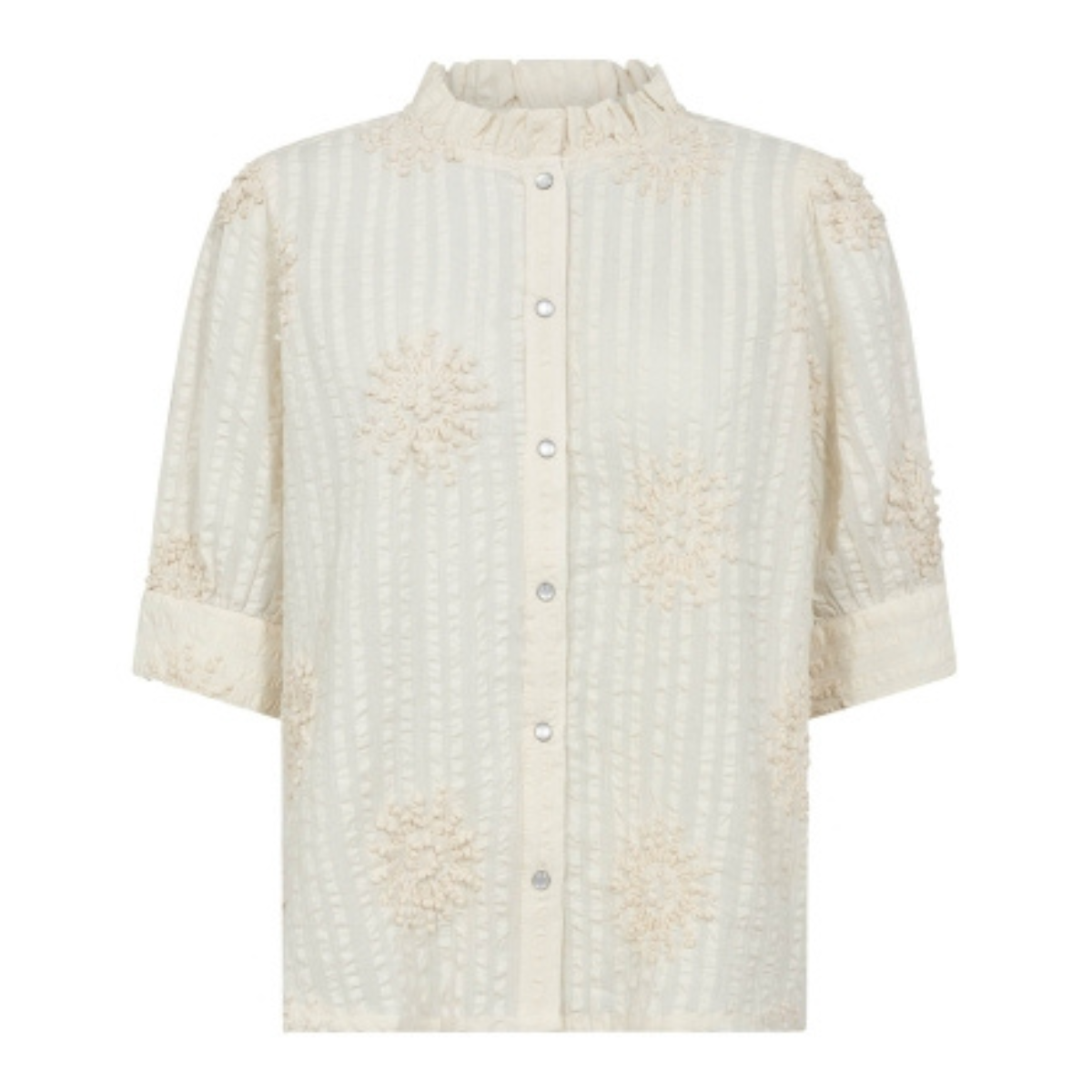 Smukkeste skjortebluse fra Gossia, med broderi. Blusen er gennemknappet med trykknapper, har korte ærmer samt en fin flæsekrave.