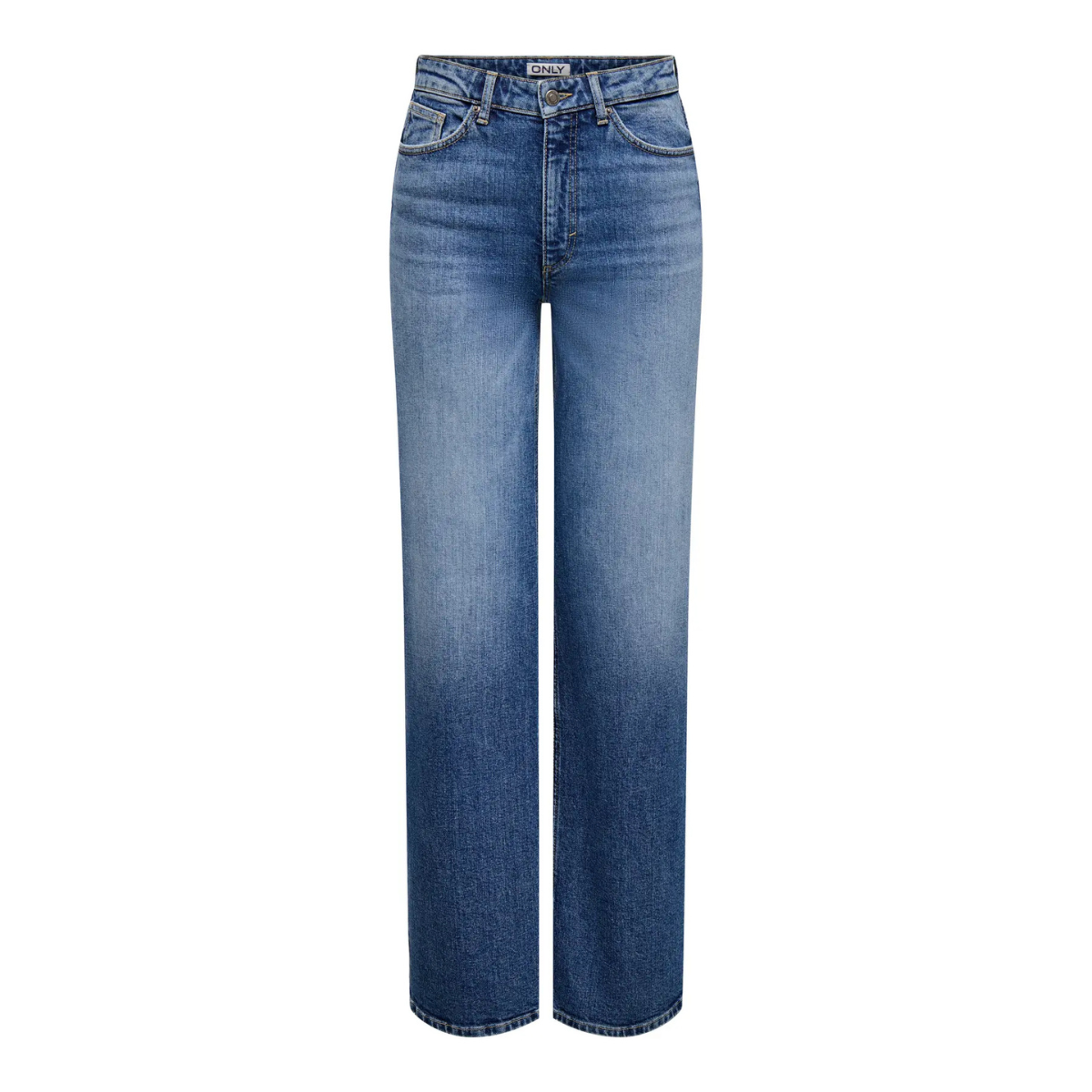 Cool højtaljede jeans fra Only. De har lommer og knap- og lynlåslukning. Buksen har noget stræk, bæltestropper samt brede ben.