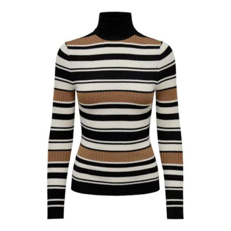 Fin bluse fra Only. Denne bluse har ribkantsdetaljer og høj krave, som kan foldes ned. Derudover er blusen tætsiddene men har godt med stræk.