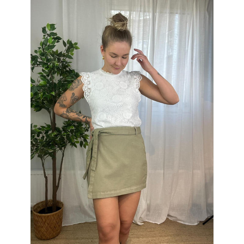 Cool slå-om denim nederdel fra Only. Nederdelen er kort og har knap i siden og bindebånd foran.