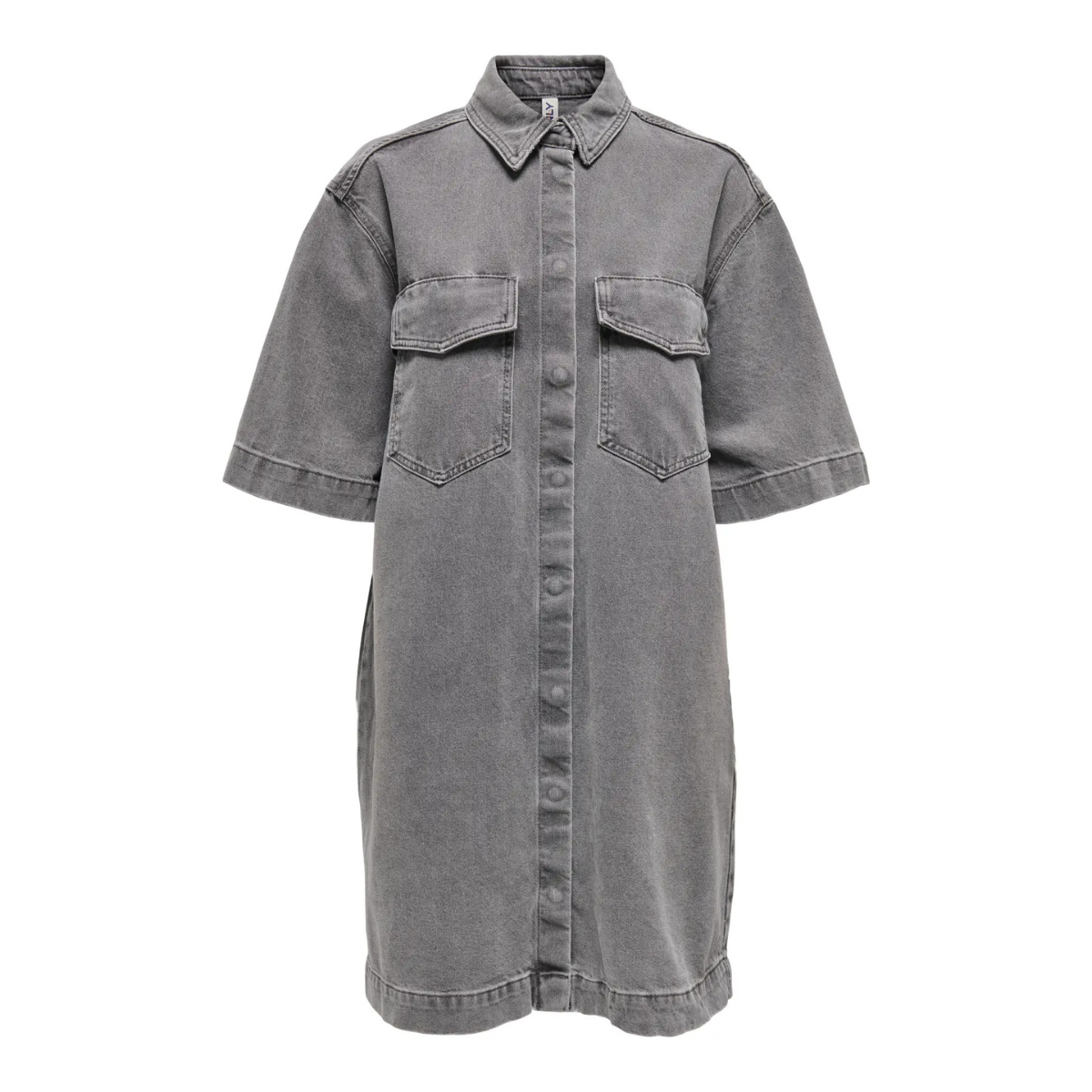 Super cool denimkjole fra Only. Kjolen er gennemknappet, har skjortekrve, korte ærmer og en lomme ved hvert bryst.