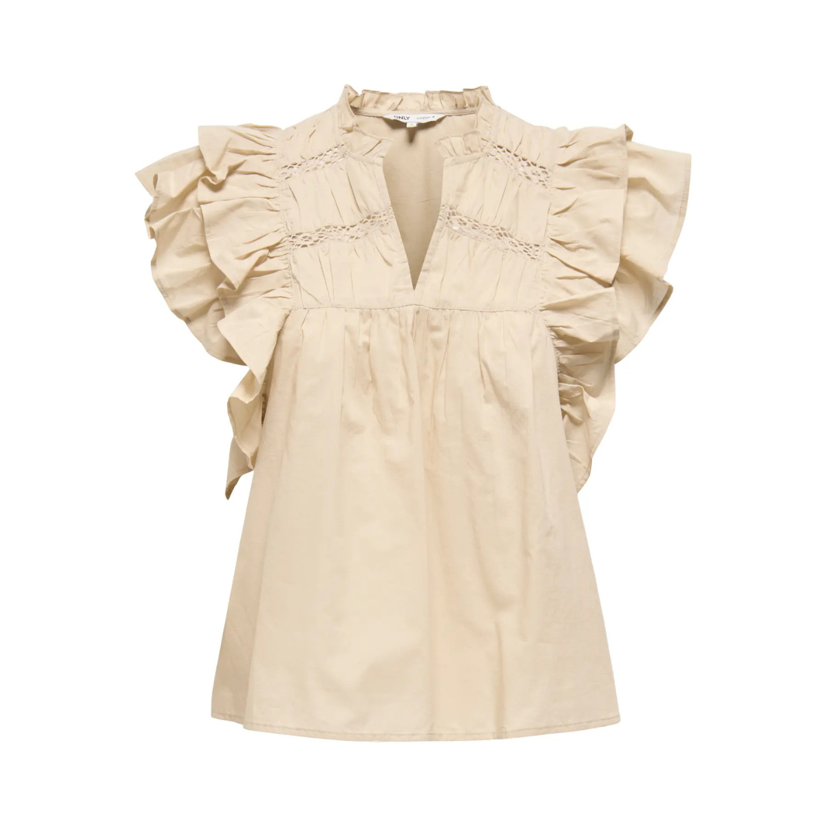 Super sød top fra Only. Toppen har V-udskæring, flæsedetaljer samt et hulmønster på brystet. Materiale: 100% Økologisk bomuld. Vaskeanvisning: Vaskes ved 30 grader. Dette produkt er produceret mere bæredygtigt og med ekstra omtanke for miljøet.