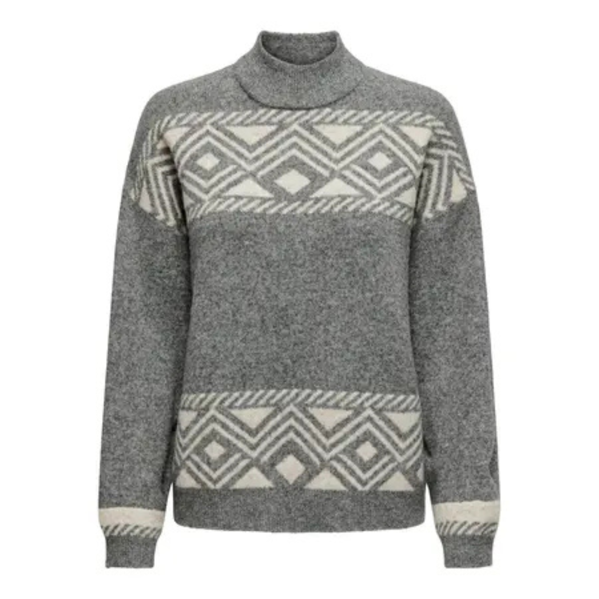Skønneste strik fra Only. Den går lidt op i halsen og har lange ærmer samt ribkant detaljer ved alle afslutningerne. Derudover er den i et flot ensartet mønster.