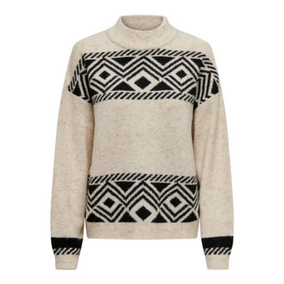 Skønneste strik fra Only. Den går lidt op i halsen og har lange ærmer samt ribkant detaljer ved alle afslutningerne. Derudover er den i et flot ensartet mønster.