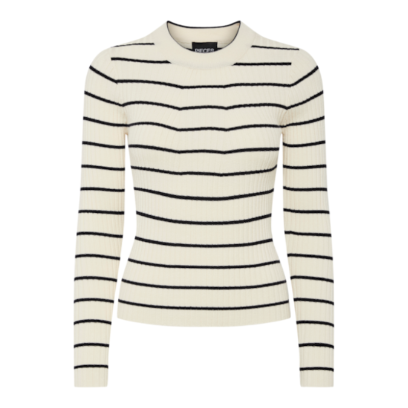 Fin strik fra Pieces. Blusen er tætsiddende, har lange ærmer og en rund halsudskæring. Derudover er den af lækkert materiale og har vandrette striber.