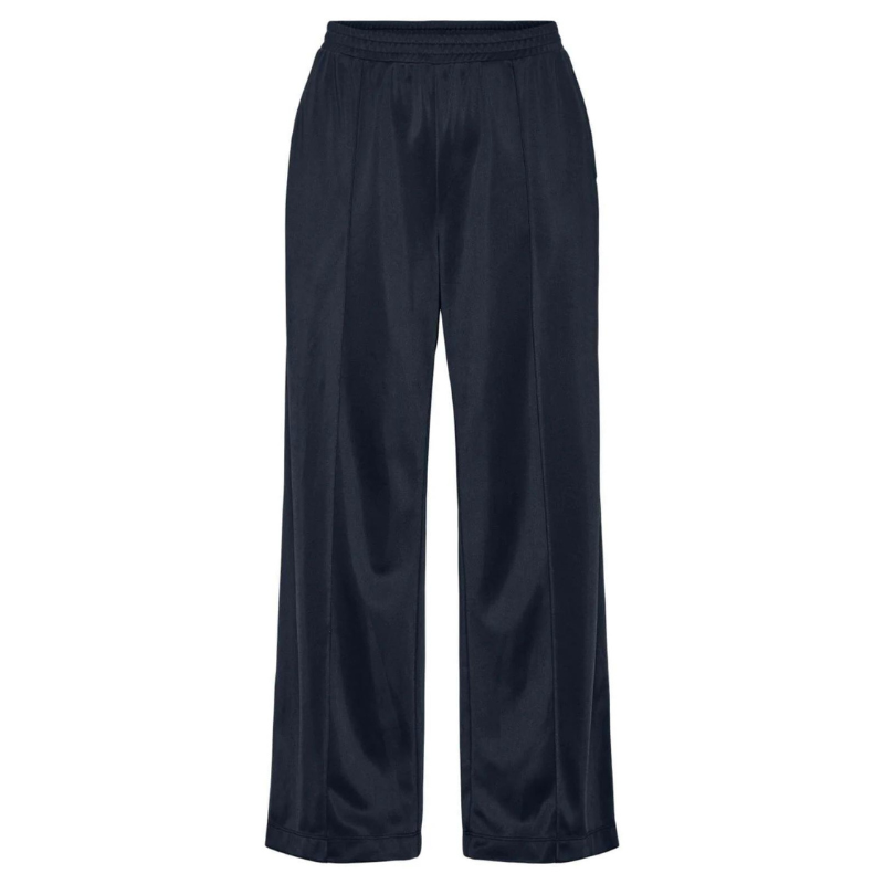Lækre bukser fra Pieces med brede ben, elastik i taljen og forlommer. Buksen har en hvid stribe langs buksebenet og kan styles med den matchende jakke.
