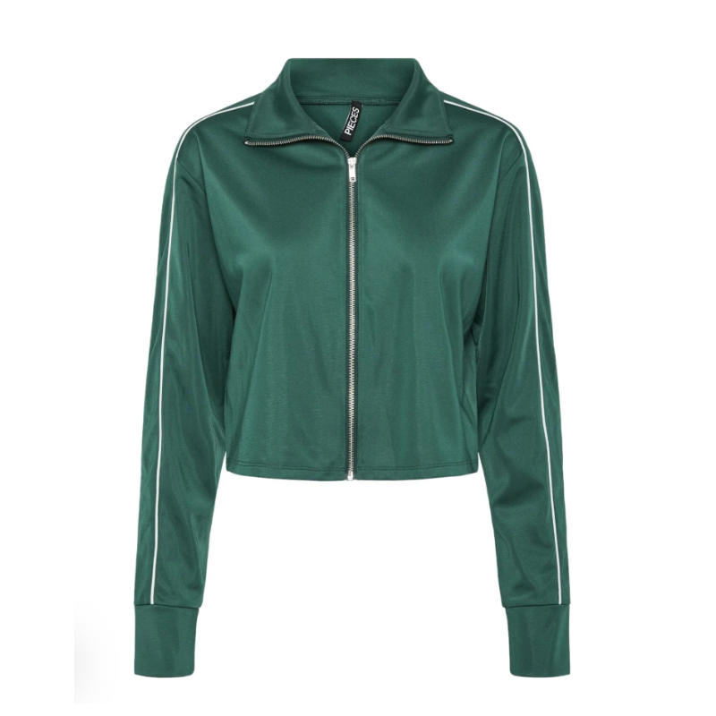 Lækker jakke fra Pieces der har lynlås, høj hals og har hvide striber ned langs ærmerne. Materiale: 100% Polyester. Vaskeanvisning: Vaskes ved 30 grader.
