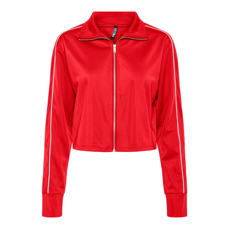 Lækker jakke fra Pieces der har lynlås, høj hals og har hvide striber ned langs ærmerne.