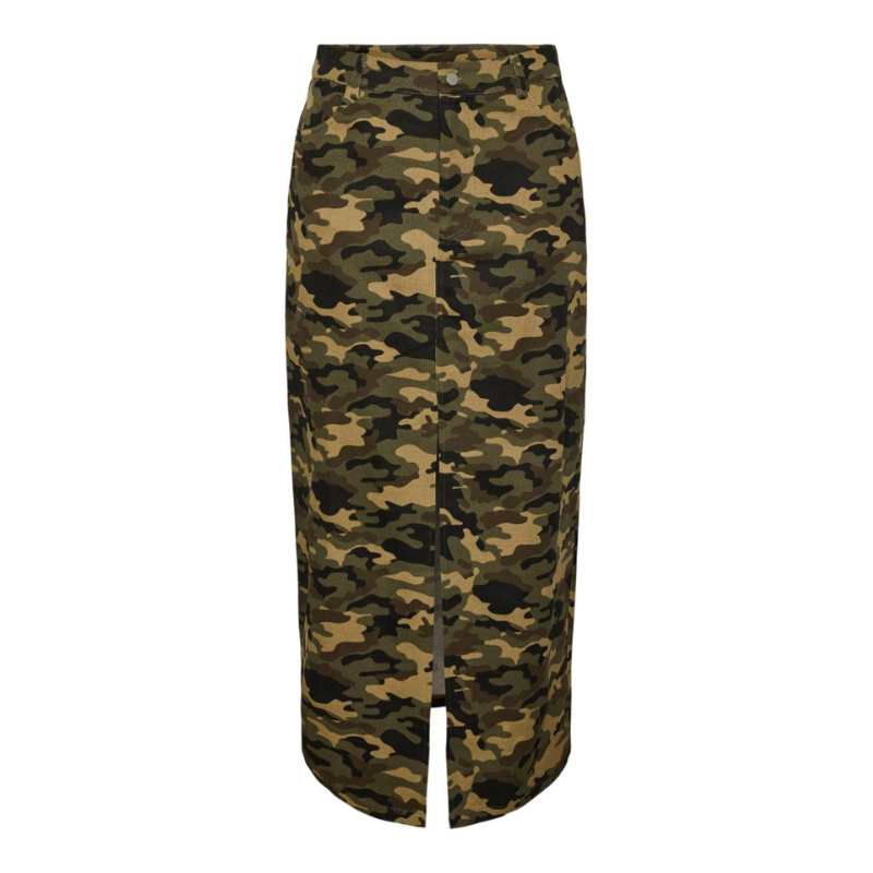 Stylen er fra en Pieces kollektion, som er lavet i samarbejde med influencerne Ditte Estrup og Cille Fjord. Nederdel i militærprint.