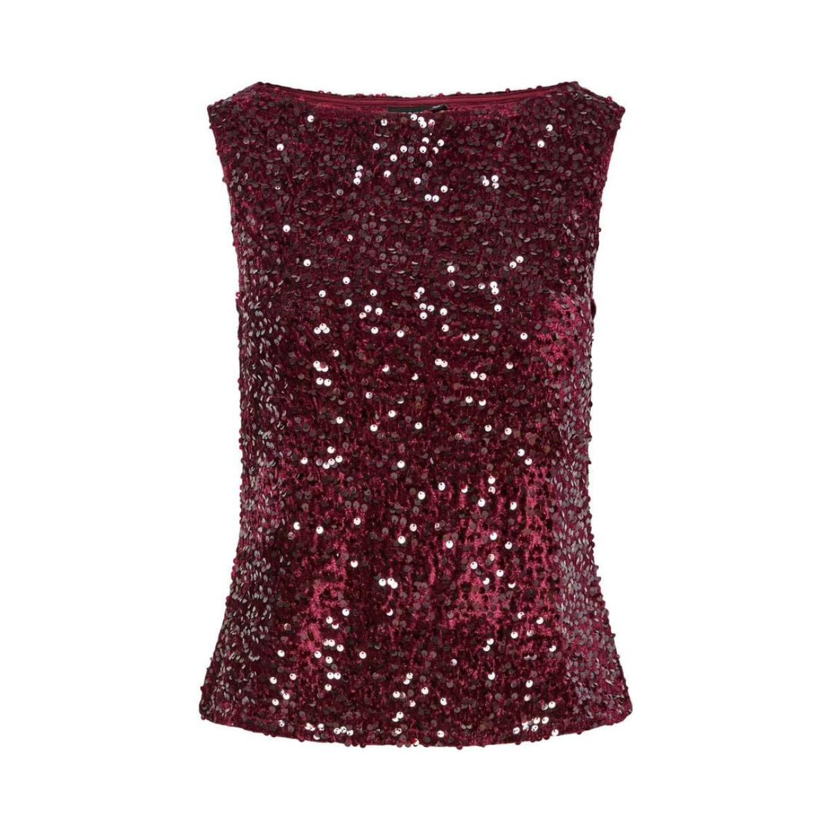 Skøn og festlig top fra Pieces. Toppen har en flot silhuet med en høj krave samt ingen ærmer og derudover har den en masse flotte pallietter.