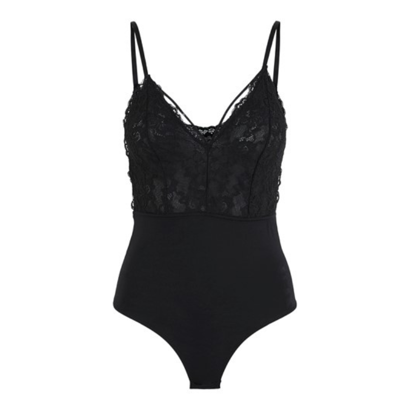 Smuk bodystocking af lækkert matriale. Denne fine bodystocking fra Pices har juster bare stropper samt V-udskæring. Derudover lukkes den med to knapper i bunden og har blonder på den øverste del.