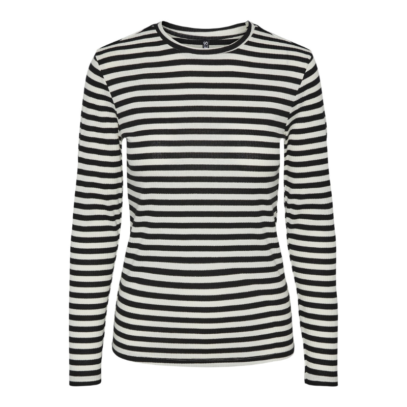 Fin basic bluse fra Pieces. Blusen har en rund halsudskæring, er tætsiddende, har lange ærmer samt vandrette striber.